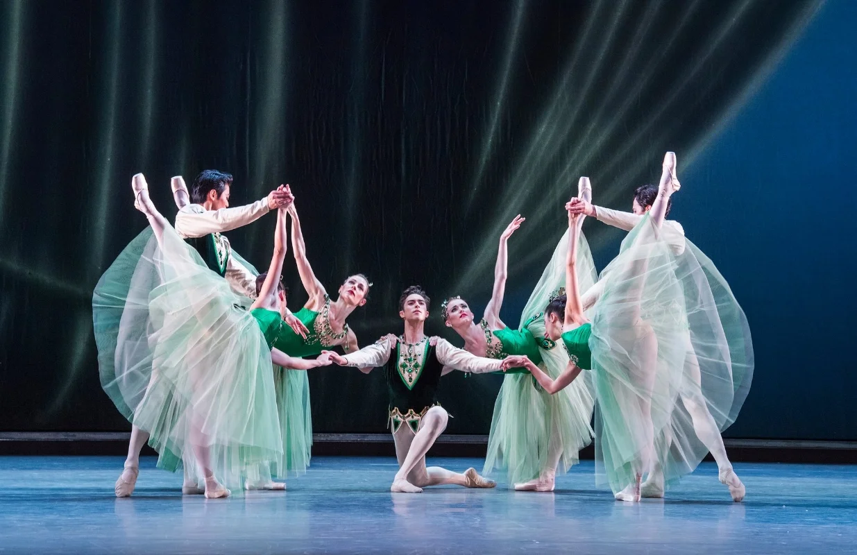 Each of the three movements draws on a different stone for its inspiration and a different composer for its sound. The French Romantic music of Fauré provides the impetus for the lyricism of ‘Emeralds’. The fire of ‘Rubies’ comes from Stravinsky and the jazz-age energy of New York. Grandeur and elegance complete the ballet in ‘Diamonds’, with the splendour of Imperial Russia and Tchaikovsky’s opulent Third Symphony. Each section salutes a different era in classical ballet’s history as well as a distinct period in Balanchine’s own life. Through it all, Balanchine displays his genius for combining music with visionary choreography."
